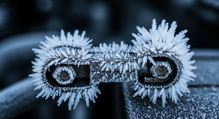 This detailed macro perspective highlights the frosty texture of a metallic object, likely a component or joint, adorned with delicate spiky hoarfrost formations in cool blue and white tones,.