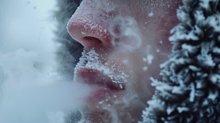Close-up of mouth and nose with heavy breathing, steam visible in the cold air generative ai