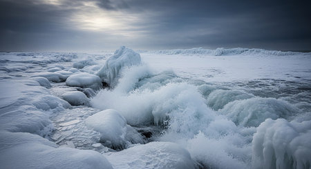 Frozen waves crash onto an icy shoreline under a dramatic cloudy sky. Clear details and vibrant colors enhance...