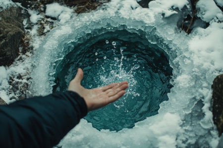 A hand is extended towards a circular pool of clear water, surrounded by ice and snow, showing the beauty of nature and the harmony of contrasting elements
