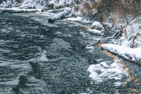 Frosty winter river. Landscape of river side. Winter in mountains. Beautiful nature in december, christmas time. Frozen and snowy stream.