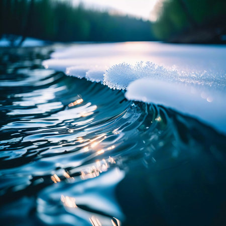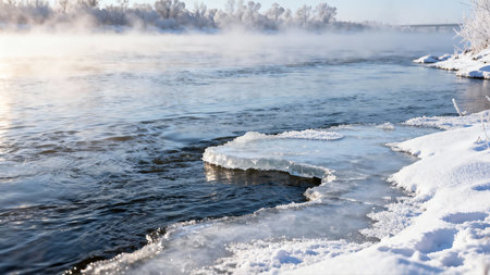 Tranquil frozen river landscape highlighted by subtle ice formations and the soft glow of winter sunlight reflecting on the water