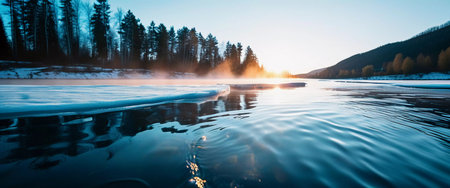 Bristling ice melts slowly, revealing clear waters beneath as the sun rises. Gentle ripples carry whispers of spring, bringing warmth and life to the tranquil river landscape.