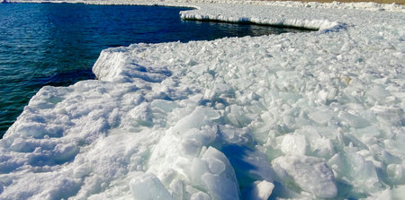 Close-up view of ice floes on a frozen lake during winter. The image captures the beauty and serenity of a winter wonderland.