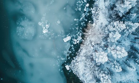 Aerial view of a frosty lakeshore featuring intricate snow patterns on frozen water, surrounded by trees, creating a tranquil winter atmosphere with copy space
