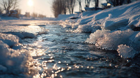 A beautiful winter scene featuring shimmering ice along the edge of a flowing stream during dawn. Sunlight reflects off the water, creating a serene atmosphere.