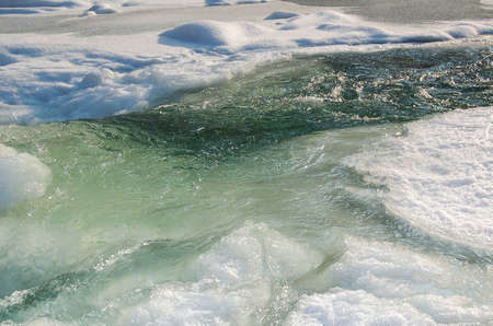 Blue winter river flows between ice floes. Arctic landscape on sunny day. Water boils and forms ripples on the sea.