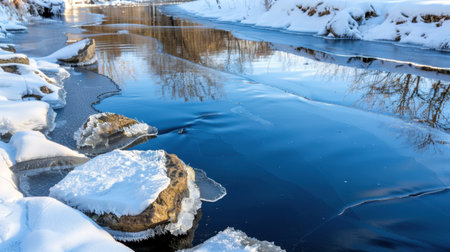 A picturesque winter scene showcasing a frozen river with ice-covered rocks and beautiful reflections on the water's surface, capturing the essence of nature.