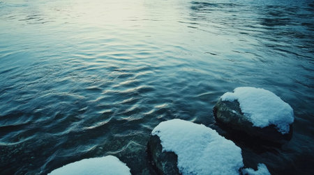 A serene winter landscape featuring snow-covered rocks along a gentle river. The tranquil water reflects soft light, evoking a peaceful atmosphere in nature.