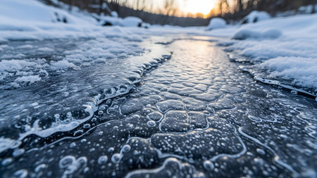 Stunning view of ice crystals along a frozen river, capturing the warm sunlight shimmering on the icy surface during sunset. Perfect winter scenery.