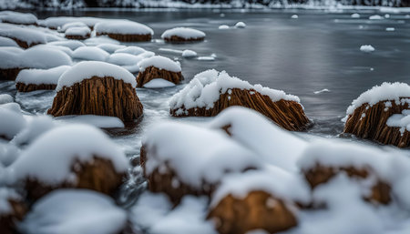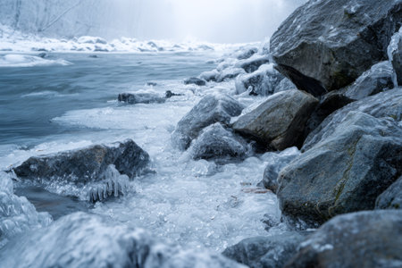 A serene winter landscape featuring snow-covered rocks, a frozen river, and intricate ice formations along...