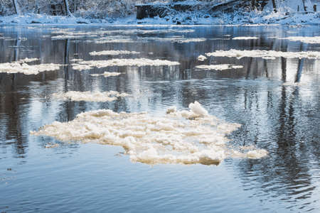 Spring melting of ice and snow on the river on a sunny day