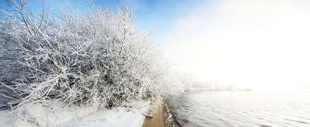 Beautiful winter landscape with snow covered trees. Panoramic banner