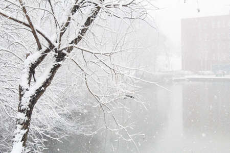 Snowfall City street with trees covered with snow. Blue winter morning, snow landscape