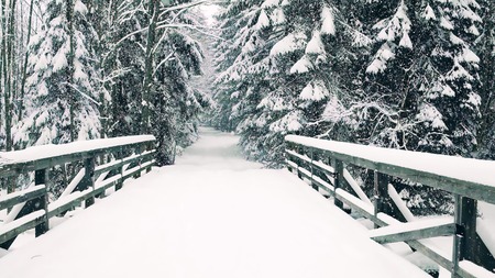 Frost-covered showing tire tracks lead down a snowy park path lined with frost covered trees keywords: winter, snow,...