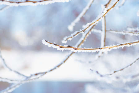 Branches under snow in hoarfrost, winter blurred natural background with bokeh, copy space