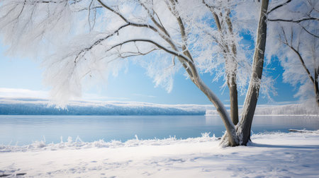 AI Generated. Beautiful Snowy Landscape With Frosted Trees Under Clear Blue Sky Background