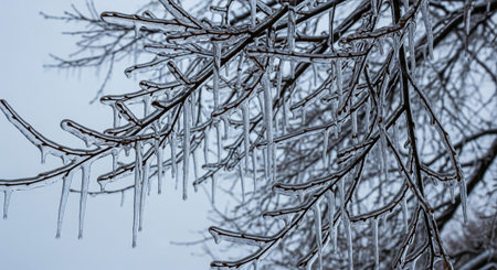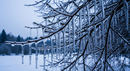 AI Generated. Winter branches covered in frost with glistening icicles and sunlight in the background during a snowy morning