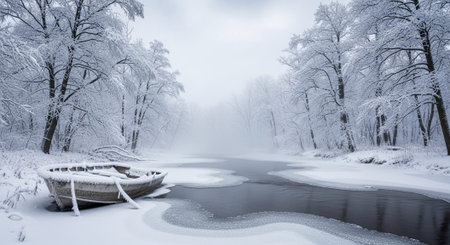 AI Generated. Serene winter landscape with frosted trees and a winding stream at twilight hour