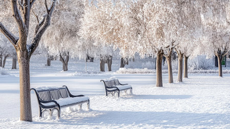 A frozen park with delicately sculpted ice benches and snow-covered trees.