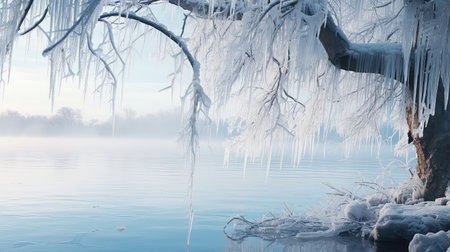 Winter Landscape Northern Winter Calm River With trees Covered With Frost And Snow in the water. Beautiful icy tree branches.