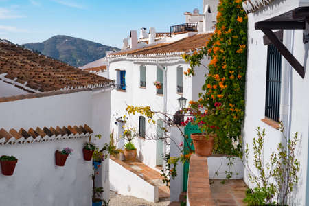 Streets in Frigiliana, typical Andalusian village with white houses, Malaga province, southern Spain