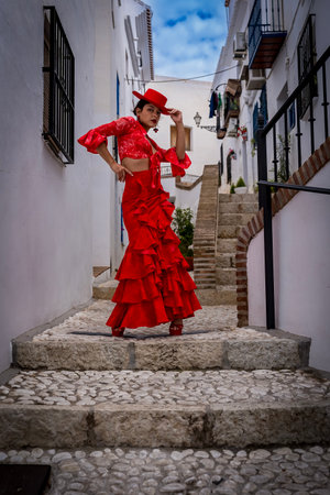 Stunning Spanish model flaunts traditional attire in picturesque Frigiliana streets.
