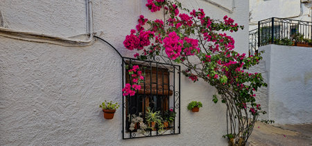 Flowers in the street of white village in el Gastor in the province of Cadiz in a sunny day