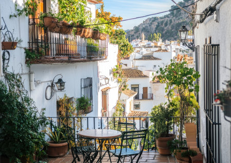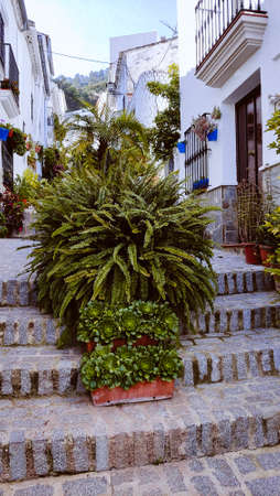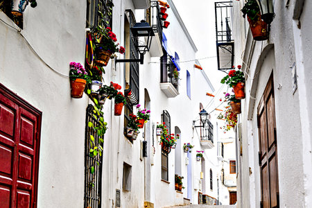 A beautiful alley with decorated houses in a white town in Andalusia, Spain