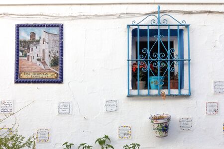 Granada, Spain, April 06, 2018: : Facade of a traditional house with decorative ceramic plates and pots of colorful flowers in the historic Albaicin neighbourhood.