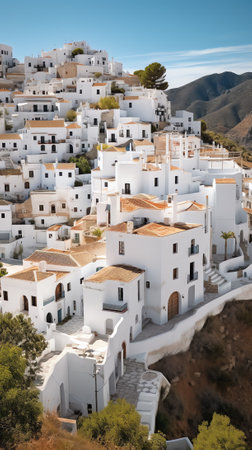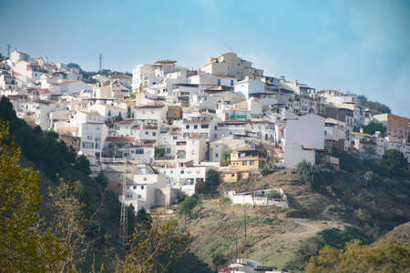 Typical white Andalucian Spanish village on slope of a mountain under clear blue sky. Ojen, Malaga, Spain.