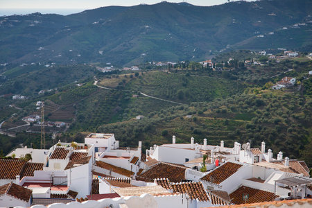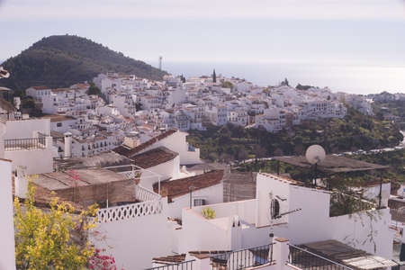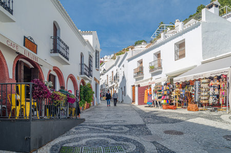 FRIGILIANA, SPAIN - JANUARY 28, 2020: Streets in Frigiliana, typical Andalusian village with white houses, Malaga province, southern Spain