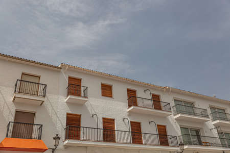 Facade of a white building with balconies on a clear day in the village of Frigiliana Malaga