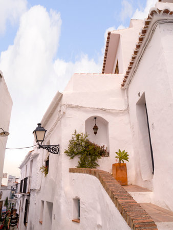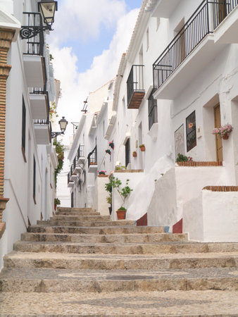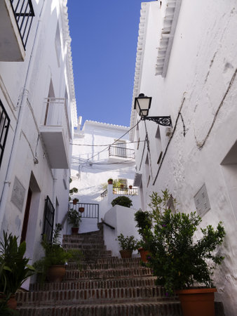 Beautiful Frigiliana village, southern Spain Charming pretty alley Traditional architecture with old fashioned white painted town houses Vertical shot