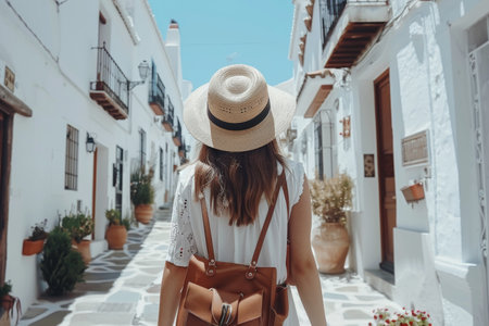 Young backpacker tourist exploring historic streets of spanish town on solo vacation trip