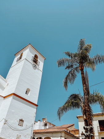 White tower of church with palm tree under a clear blue sky. Village in Andalucia, Spain.
