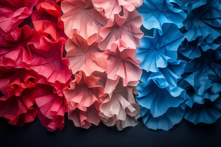 Red white and blue crepe paper on black background. Generative AI