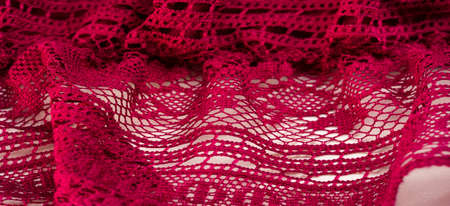 red lace fabric, red lace patterned with flower shape on a white background. background texture, pattern.