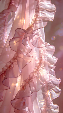 A creative digital illustration depicting Artistic design of chiffon silk ruffles layered, airy texture, backlit translucency, romantic luxury, blush pinks with floating light. This AI-generated artwork features unique visual elements suitable for various commercial and editorial applications. AI-generated illustration.