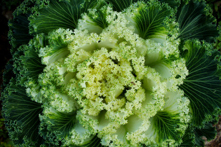 Top view of white-green decorative cabbage looking like a big carved flower. Deep colors. Natural decoration of the landscape or garden.