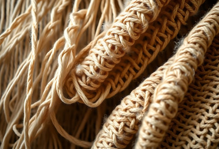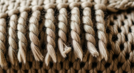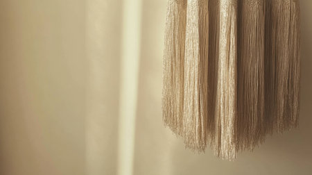 Close-up of beige textured fabric with braided fringe details. That the image is generated using AI.