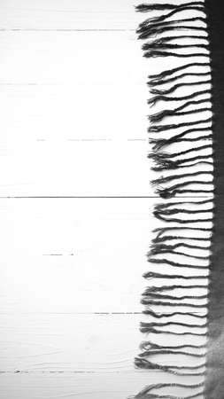 Brown plaid blanket with long edges on a white desk surface. Textile in interior design. Warming up cozy material to cover up when studying or working from home in isolation. Autumn vibes at home.