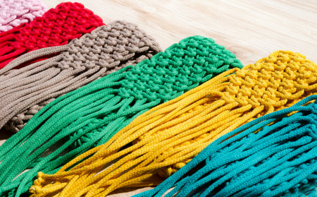 Close-up of a beautifully crafted macrame piece highlighting intricate knots and patterns illuminated by soft natural light.