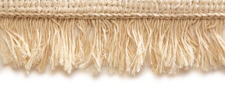 Close up beige cotton fabric texture with fringe edge. Natural vintage textile background..