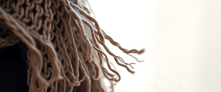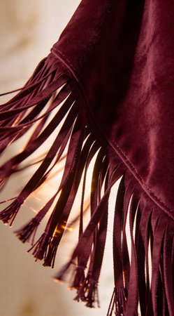 A creative digital illustration depicting Creative design of deep plum suede fringe details, tasseled edges macro, gentle swaying highlights, bohemian opulence. This AI-generated artwork features unique visual elements suitable for various commercial and editorial applications. AI-generated illustration.