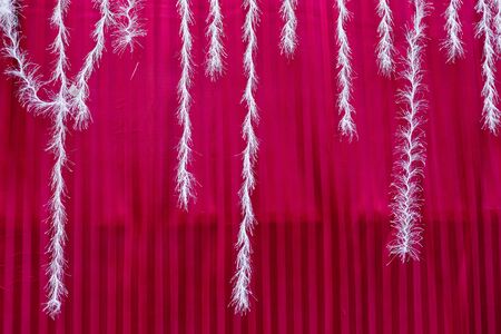 Red tassels background close up. Woman handicraft. Art, creativity, hobby, home workshop concept