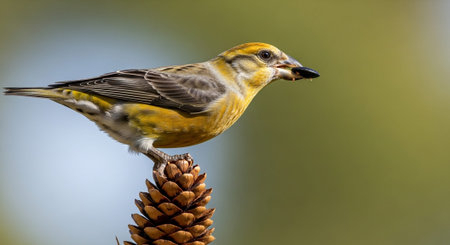 a small bird perches on a moss-covered branch in the norwegian wilderness, showcasing a beautiful blend of dark yellow and orange hues. the bird strikes a dignified pose, reminiscent of wimmelbilder and whistlerian art styles. this national geographic photo captures the essence of cranberrycore aesthetics in the midst of stunning norwegian nature. ai generated