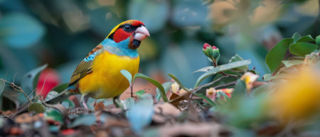 beautiful yellow and blue bird standing on the ground looking for food. generative ai