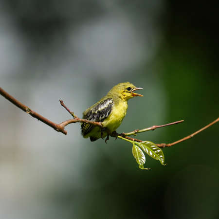 A small, yellow bird is perched on a branch, showcasing bright plumage. The image features a close-up composition with soft focus in the background, primarily green hues. The bird is the central focus with detailed feather textures and a blurred setting. Suitable for various editorial and commercial projects.