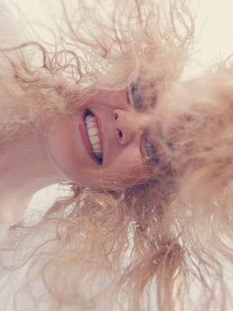 Happy woman having wet blonde hair. Positive clean female after taking a shower feeling clean and relaxed. Unusual crazy bottom angle.
